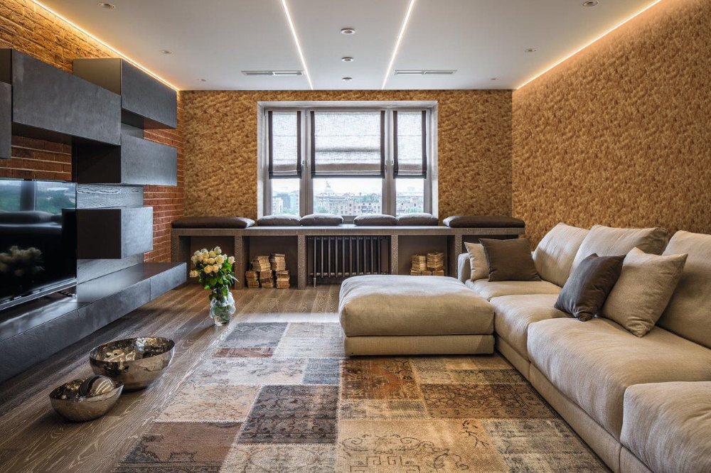 Liquid wallpaper in the living room interior: photo examples for inspiration