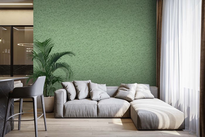 Зеленые жидкие обои создают уютную и расслабляющую атмосферу. Для гостиной идеально подойдут теплые тона, такие как жидкие обои салатового цвета. -